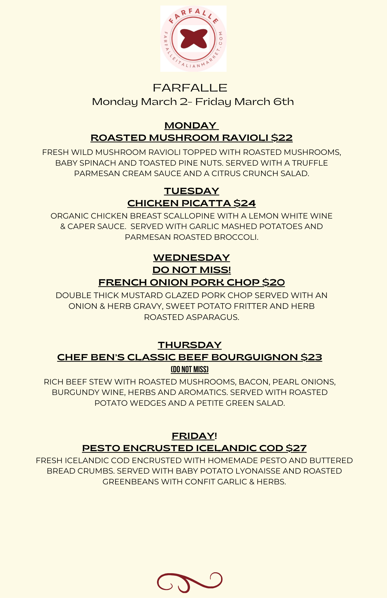 Every week we send out Chef Ben’s menu for the upcoming week. This menu includes all the offerings for the coming week including meals, appetizers, desserts, market items to accompany your meal and beverage pairings. You then select what items you would like for which days through our online order form. Then you sit back knowing that on whichever day (or days) you selected you will receive your full gourmet dining. All that’s left for you to do is to follow the provided heating instructions and enjoy!